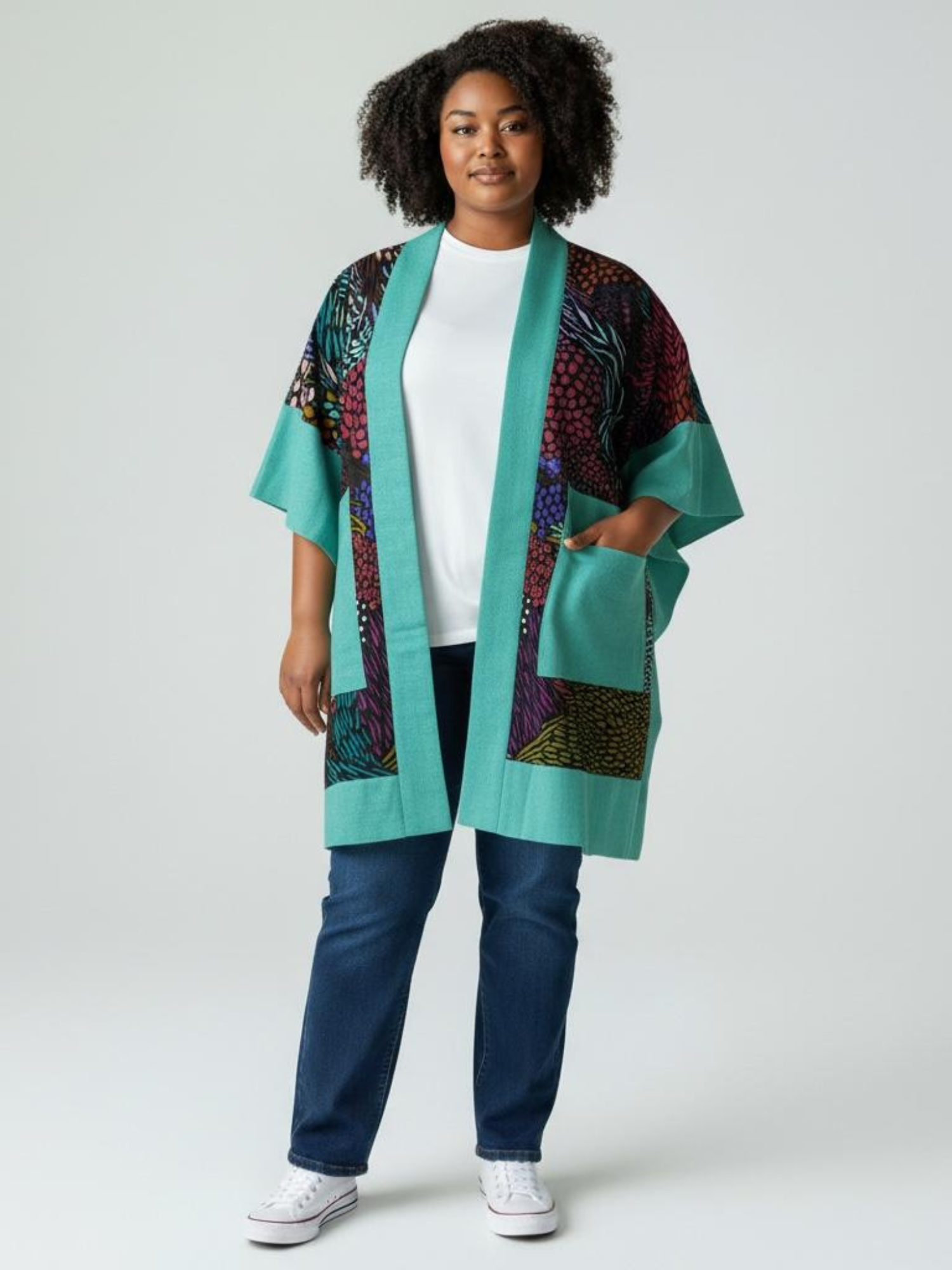 Product Details: Crafted from premium Ankara cotton fabric, it offers a relaxed fit that drapes beautifully on every silhouette. The open-front design, wide sleeves, patch pockets, and knee-length cut make it a versatile piece perfect for layering over a dress, styling with jeans, or wearing as a chic cover-up. Finished with a refined trim of Aso Oke fabric, this kimono blends rich African craftsmanship with modern elegance.